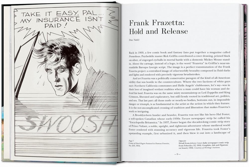 Frank Frazetta has reigned as the undisputed king of fantasy art for 50 years, his fame only growing in the years since his death. With his paintings now breaking auction records (Egyptian Queen sold for $ 5.4 million in 2019) he’s long overdue for this ultimate monograph.Born to a Sicilian immigrant family in Brooklyn, 1928, Frazetta was a minor league athlete, petty criminal and serial seducer with movie star looks and phenomenal talent. He claimed to only make art when there was nothing better to do – he preferred playing baseball - yet began his professional career in comics at age 16. Strip work led him to the infamous EC Comics, then to oils for Tarzan and Conan pulp covers. Both characters were interpreted by many before him, but as he explained in the 1970s, “I’m very physical minded. In Brooklyn, I knew Conan, I knew guys just like him,” and he used this first-hand knowledge of muscle and macho to redefine fantasy heroes as more massive, more menacing, more testosterone-fueled than anything seen before. As counterbalance he created a new breed of women, nude as censorship allowed, with pixie faces and multiparous bodies: thick thighed, heavy buttocked, breasts cantilevered out to there, yet still, with their soft bellies and hints of cellulite, believably real. Add in the action, the creatures, the twilit worlds of haunting shadow and Frazetta’s art is addictive as potato chips.