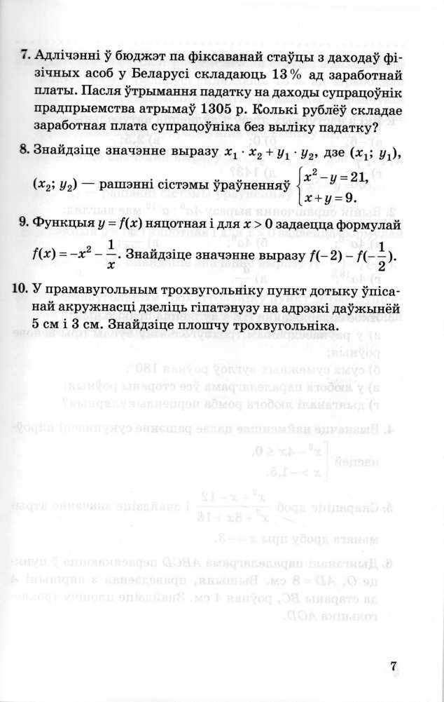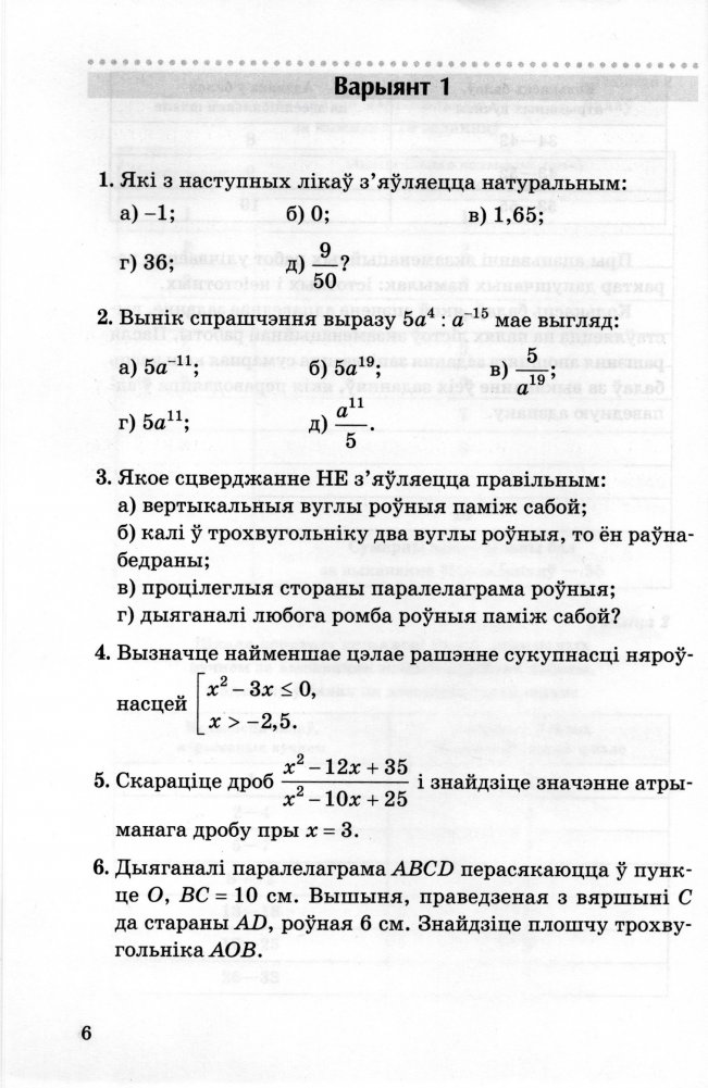 Заданні згрупаваны па варыянтах. У кожным варыянце прадстаўлена 10 заданняў (па два заданні, адпаведныя кожнаму ўзроўню вучэбнай дзейнасці), якія ўключаюць заданні алгебраічнага і геаметрычнага кампанентаў.