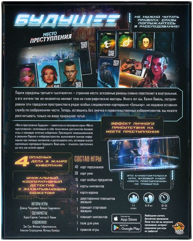 "Место преступления: Будущее" – новая игра из популярной серии "Место преступления", сочетающая в себе технические достоинства базовой и неоновую эстетику киберпанка. Преследуйте злоумышленников в реальном Париже и киберпространстве, выискивайте нужную информацию при помощи имплантов и распутывайте сеть заговоров внутри крупнейших корпораций будущего. Ваша цель – отыскать преступника до того, как истечёт время!