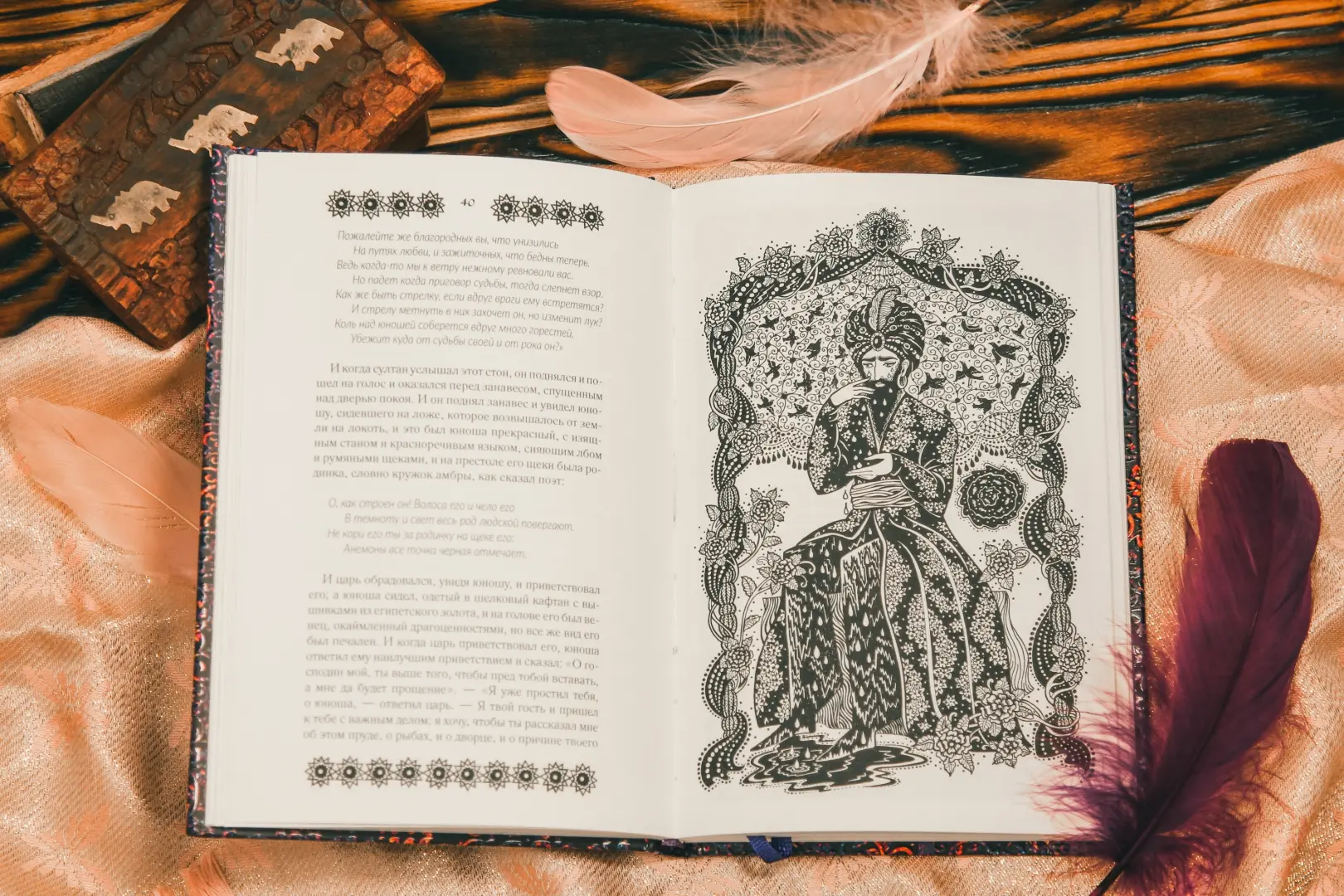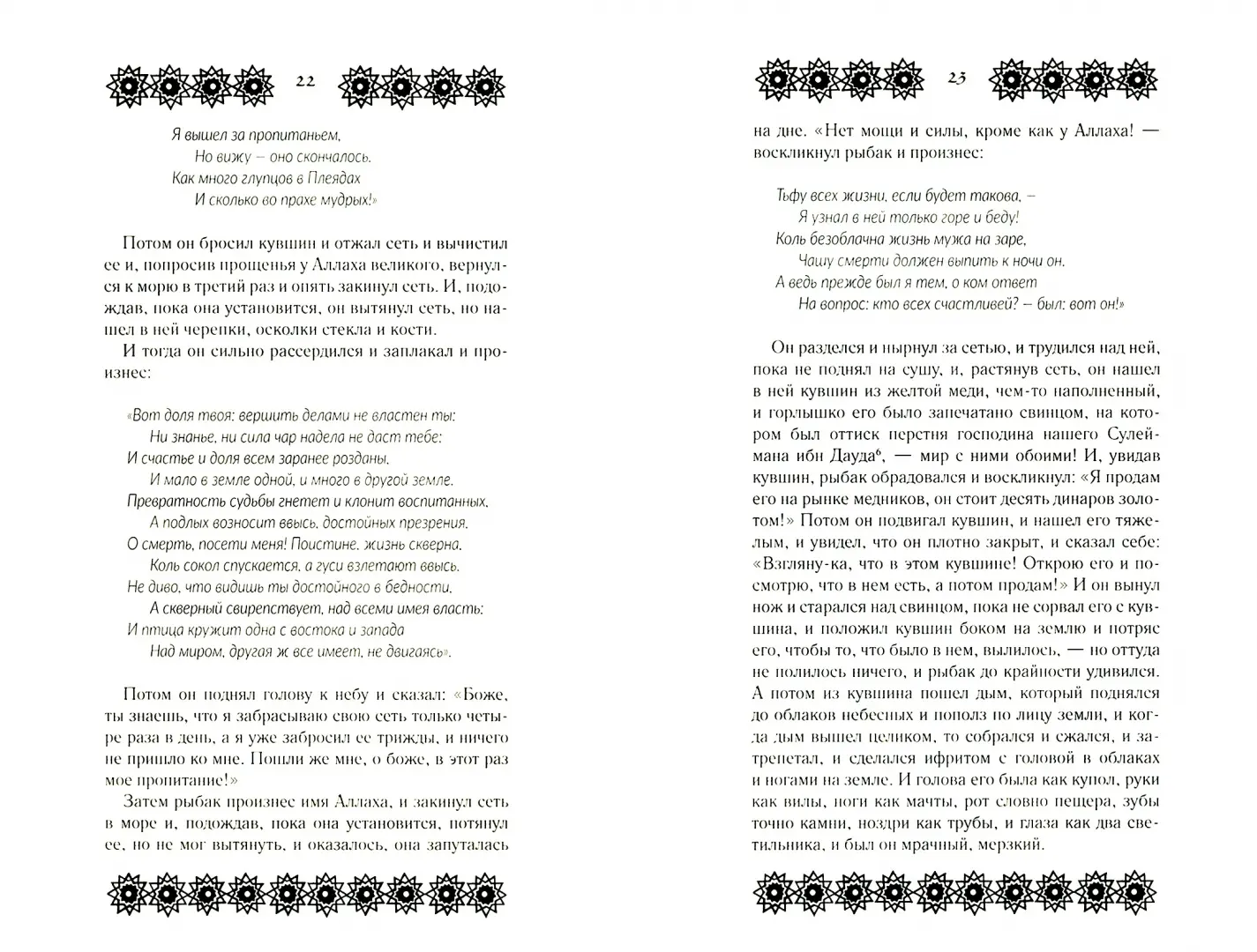 В историях прекрасной Шахразады переплетаются героические и плутовские, мифологические и любовные сюжеты индийского, персидского, арабского народов. Причудливая фантазия, сложные авантюры, яркие описания удивительных стран и городов, а также обольстительные красавицы, богатейшие правители, джинны и колдуны-все это прихотливо переплетается с реалистическим изображением жизни и быта простых людей, ловких и неунывающих.
