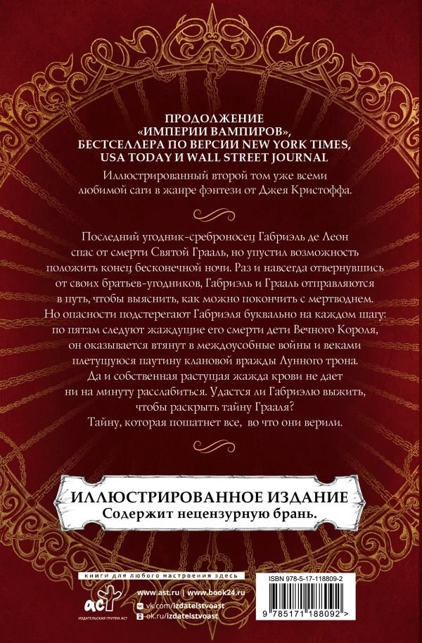 Последний угодник-среброносец Габриэль де Леон спас от смерти Святой Грааль, но упустил возможность положить конец бесконечной ночи. Раз и навсегда отвернувшись от своих братьев-угодников, Габриэль и Грааль отправляются в путь, чтобы выяснить, как можно покончить с мертводнем. Но опасности подстерегают Габриэля буквально на каждом шагу: по пятам следуют жаждущие его смерти дети Вечного Короля, он оказывается втянут в междоусобные войны и веками плетущуюся паутину клановой вражды Лунного трона. Да и собственная растущая жажда крови не дает ни на минуту расслабиться. Удастся ли Габриэлю выжить, чтобы раскрыть тайну Грааля? Тайну, которая пошатнет все, во что они верили.