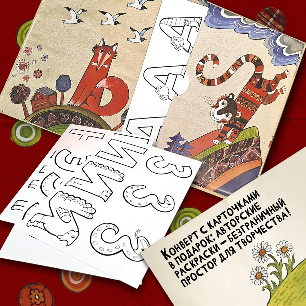 На форзаце вклеен конверт с карточками, на которых изображены буквы алфавита. Ребенок знакомится с азбукой и получает безграничный простор для творчества: он может не просто раскрашивать буквы, а самостоятельно совершать с ними самые невероятные превращения.