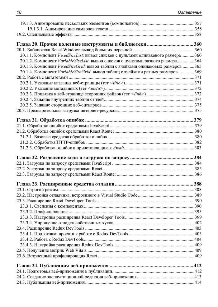 Далее ведется рассказ о работе с метаданными, разделении кода, обработке ошибок, отладочных инструментах (включая расширения веб-обозревателя React Developer Tools и Redux DevTools), публикации готового веб-приложения с использованием веб-серверов Apache HTTP Server и serve.
