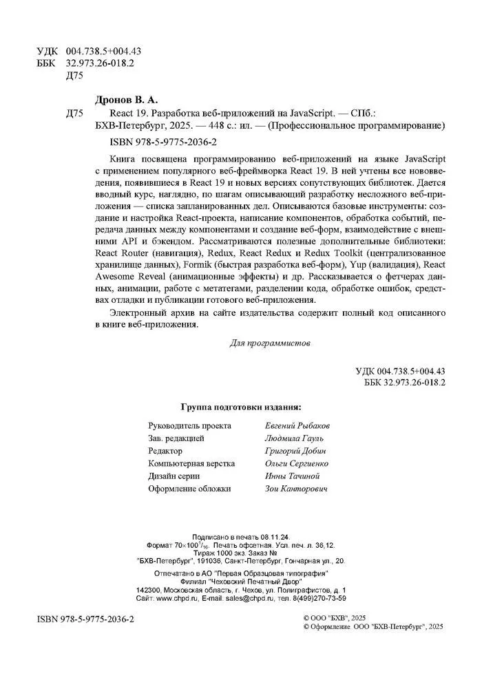 Книга посвящена разработке веб-приложений на языке JavaScript с применением популярного клиентского веб-фреймворка React 19. В ней учтены все нововведения, появившиеся в React 19 и новых версиях сопутствующих библиотек.
