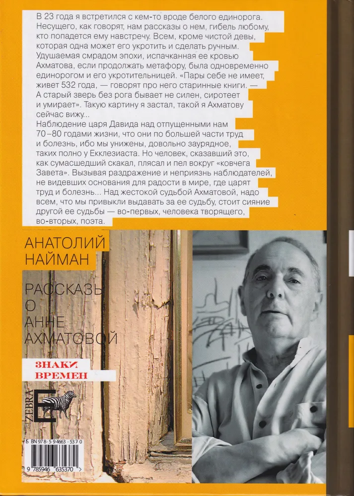 "В 23 года я встретился с кем-то вроде белого единорога. Несущего, как говорят, нам рассказы о нем, гибель любому, кто попадется ему навстречу. Всем, кроме чистой девы, которая одна может его укротить и сделать ручным. Удушаемая смрадом эпохи, испачканная ее кровью Ахматова, если продолжать метафору, была одновременно единорогом и его укротительницей. "Пары себе не имеет, живет 532 года, - говорят про него старинные книги. - А старый зверь без рога бывает не силен, сиротеет и умирает". Такую картину я застал, такой я Ахматову сейчас вижу..." Анатолий Найман.