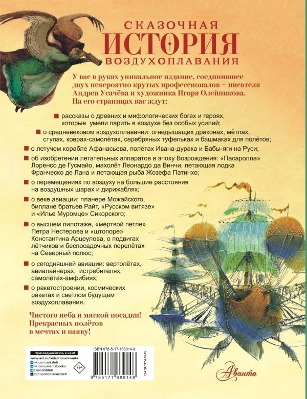 Вы держите в руках полноценную энциклопедия, посвященную воздухоплаванию. В ней и история развития воздухоплавания (от летательных аппаратов эпохи Возрождения, воздушных шаров и дирижаблей до реактивных самолетов и космических ракет), и рассказы о веке авиации, о планерах и бипланах, а также о потрясающих подвигах летчиков. Кроме того, о мифах, легендах и литературных произведениях, герои которых летают, используя ковры-самолеты и ступы, птиц и пушечные ядра, зонтики и моторчики, а то и совсем необычные средства… Иллюстрации Игоря Олейникова украшают каждую страницу этой пропитанной любовью к небу и полетам удивительной книги. Для младшего и среднего школьного возраста.
