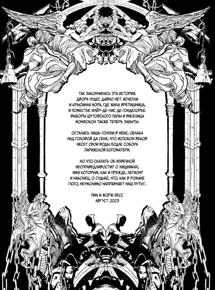 Печальная судьба Эсмеральды и Квазимодо, которые оказались бессильны против жестокости и несправедливости, находит отражение в талантливой интерпретации Жоржа и Пиа Бесс. С помощью выразительной черно-белой графики они переносят читателя в атмосферу средневекового Парижа и позволяют заново пережить трагическую историю, развернувшуюся под сводами мрачного и величественного собора.