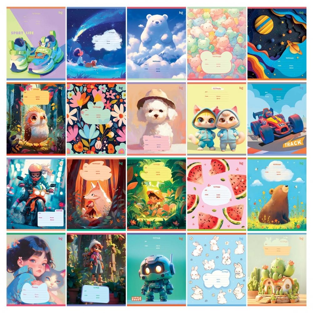 Тетрадь BG серии "Super Mix-20" клетка . Формат А5 (165*205 мм). Вид крепления – скрепка. Внутренний блок – это 18 листов, офсетная бумага плотностью 60 г/м². Обложка выполнена из мелованного картона. Тетради с ярким дизайном идеально подойдут для школьников любого года обучения.