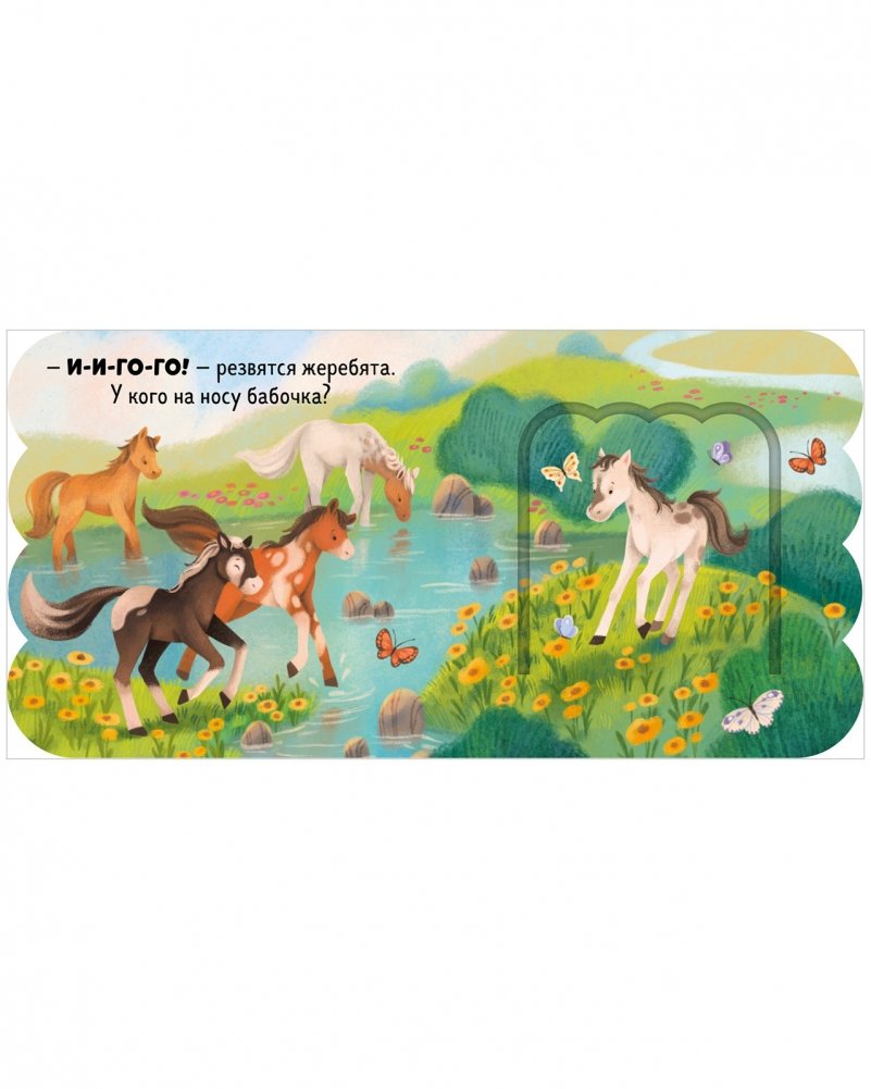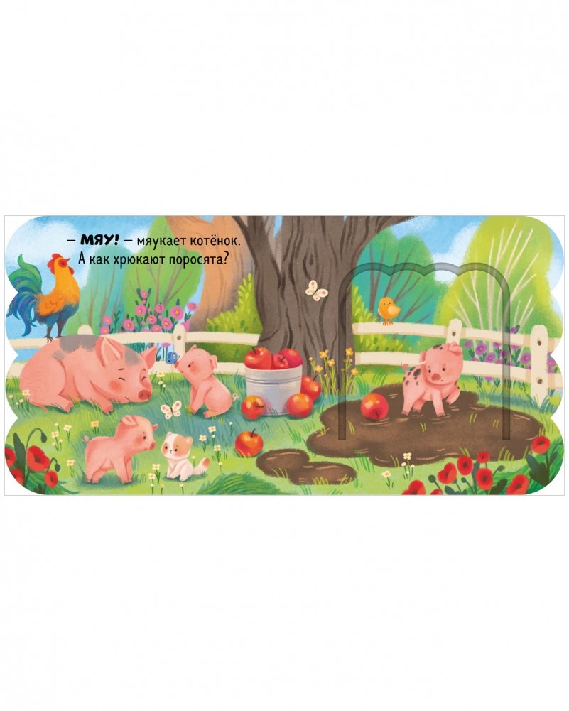 На каждом развороте маленький читатель найдет панорамную иллюстрацию, вопрос на сообразительность («Как хрюкают поросята?») и ответ, который спрятался в окошке («Хрю-хрю!»).