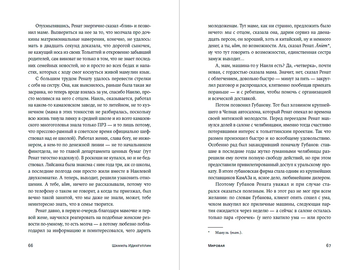 «Мировая» — дебют дважды лауреата премии «Большая книга» Шамиля Идиатуллина. Впервые роман был опубликован в 2004 году.