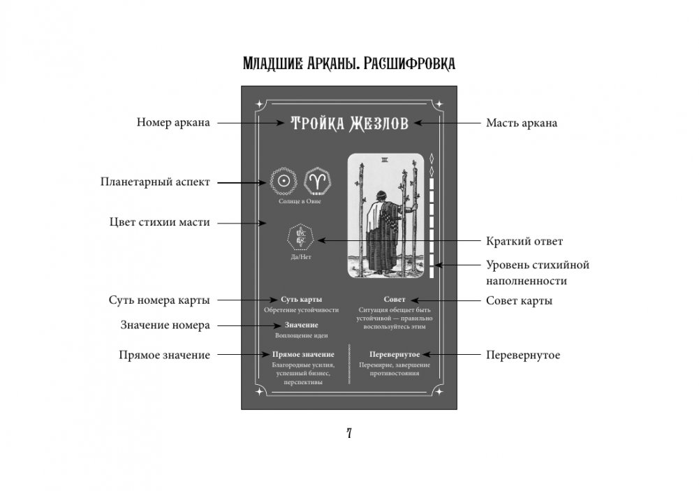 Если вы хотели обучиться гаданию на Таро, но вам сложно запоминать толкования, если вы не понимаете структуру арканов или не можете прочесть знаки — эта обучающая колода для вас. "Таро Уэйта. Эффективное обучение" — обучающее Таро нового поколения. На картах начерчены толкования, руны и астрологические знаки, которые помогут запомнить значения карт, увидеть на них больше информации и трактовать выпавшие карты точнее. Чтобы начать практиковать Таро, вам нужен только этот комплект: в книге 50 раскладов, каждый из которых вы можете разложить и сразу же трактовать. Доверяйте своим толкованиям с первого предсказания! В комплекте: колода из 78 карт с иллюстрациями Таро Уэйта с толкованиями, рунами и астрознаками на каждой карте и подробная инструкция по работе с колодой, включая дополнительные значения и 50 основных раскладов, все упаковано в подарочную коробку с картонным фиксатором (ложементом).