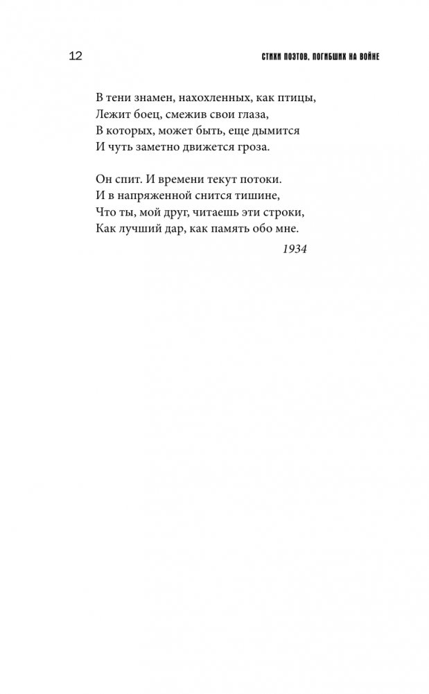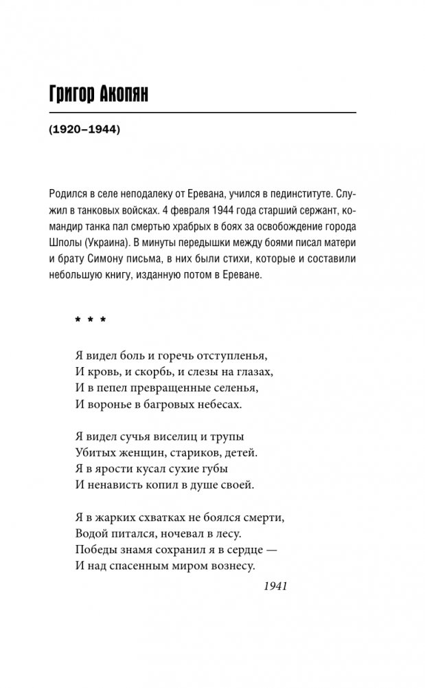 "Строки, рожденные в боях", "строки, оборванные пулей" - за этими расхожими выражениями, ставшими слишком привычными, стоят судьбы и трагедии многих людей. 22 июня 1941 года навсегда разделило миллионы судеб на "до" и "после". Но для авторов этой книги никакого "после" не было. Все они отдали жизнь за Победу, за Родину, за мир. И все они были поэтами, не по профессии – по духу. Их опаленные войной строки читали в окопах и блиндажах, печатали в газетах, перечитывали в полных нежности письмах. В этих строках, зачастую неумелых, наивных – истовость любви к Родине, неугасимое пламя мужества, ярость святой ненависти к врагу. Бесконечно трогательные, правдивые, искренние – их стихи не могут устареть, ведь ничто подлинное, настоящее, чистое не подвластно времени. Потому и сегодня они настолько злободневны и понятны каждому, что только даты жизни их авторов напоминают, сколько им лет.