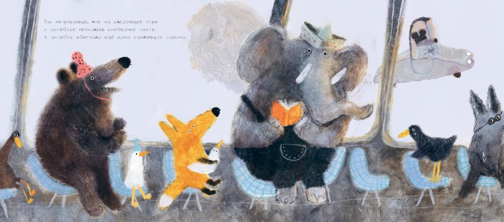 А когда не спала, водила автобус. Каждый день она возила зверей по их звериным делам. Пока её вместе с автобусом не обогнала маленькая чёрная кочерыжка на колёсах...