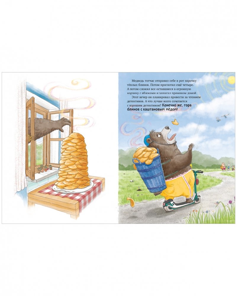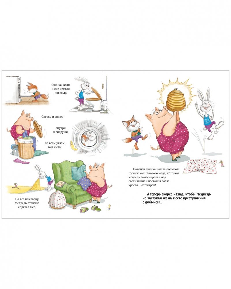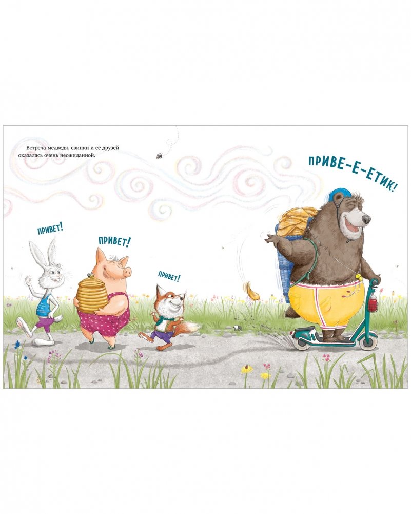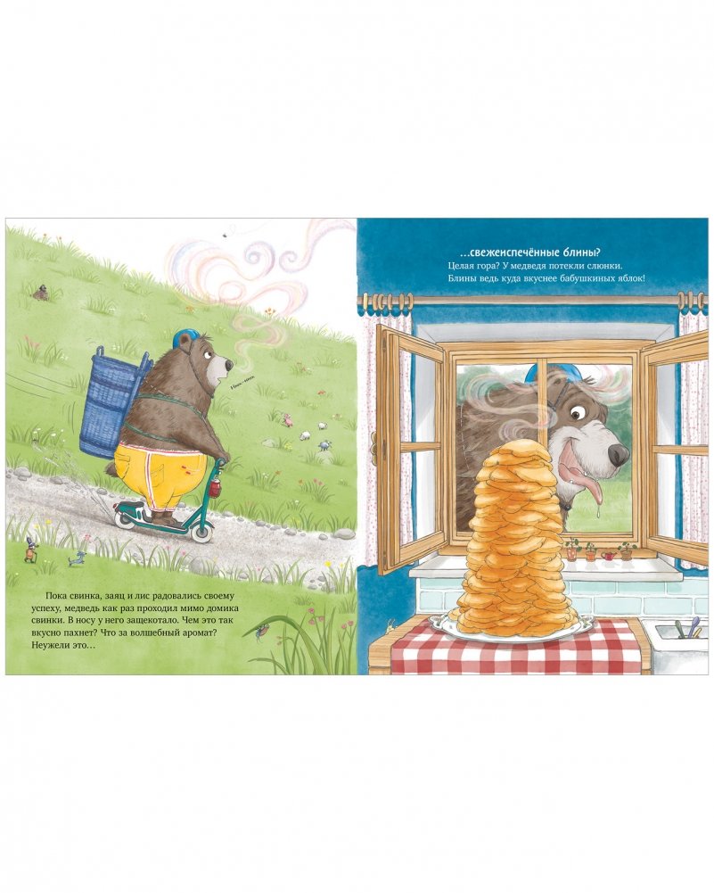 Свинка напекла блинов и решила взять немного меда у медведя… не спросив хозяина. А медведь решил стащить у свинки блины. По дороге друзья-воришки встретились! Что же произошло дальше? К счастью, все закончилось хорошо! Обязательно обсудите с детьми, как важно спрашивать разрешения, когда хочешь позаимствовать что-то у друзей.