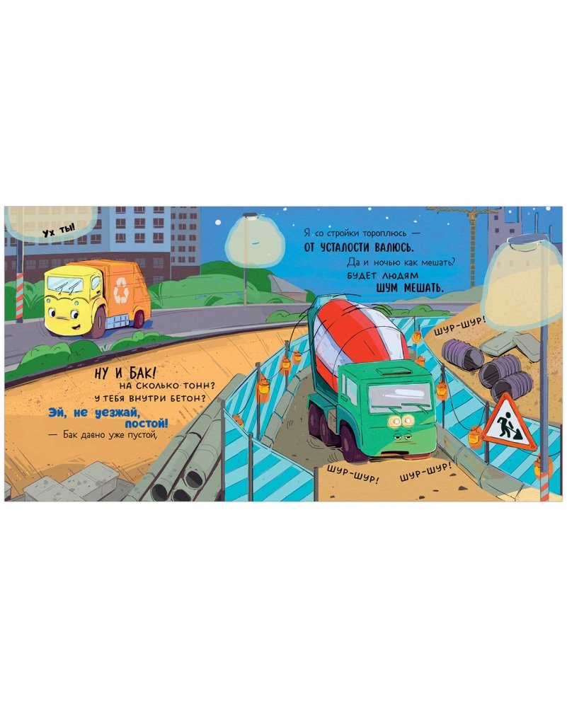 Как и всем детям, малышу мусоровозу очень не хочется ложиться спать. Он хочет продолжить веселье и отчаянно ищет, с кем бы ему покататься по ночным улицам. Но бетономешалка целый день трудилась на стройке, трамвай и электробус возили пассажиров, а самосвал доставлял груз, и все они очень устали и спешат на стоянку и в депо.