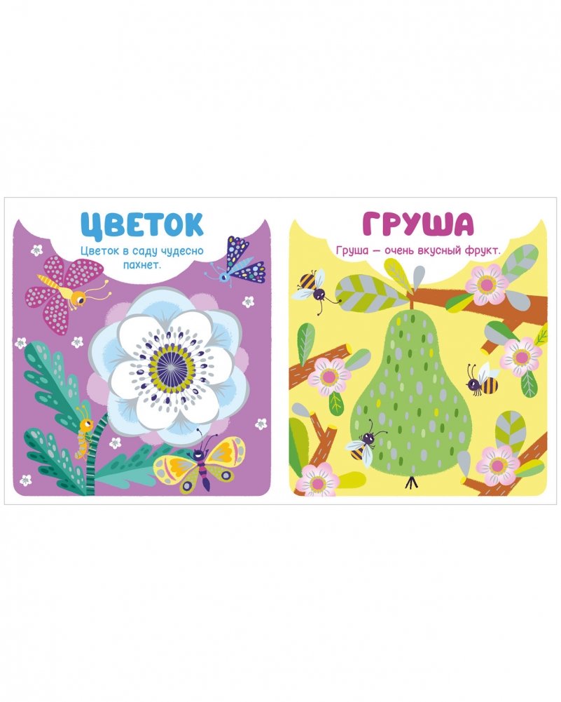 На каждой страничке — картинки и слова. Вот яблоко, а в нем живет червячок. Рассматривая эту яркую с блестящей фольгой иллюстрацию, ребенок сможет придумать историю по картинке, развивая речь, выучить новые слова. А листая картонные страницы, будет развивать мелкую моторику.