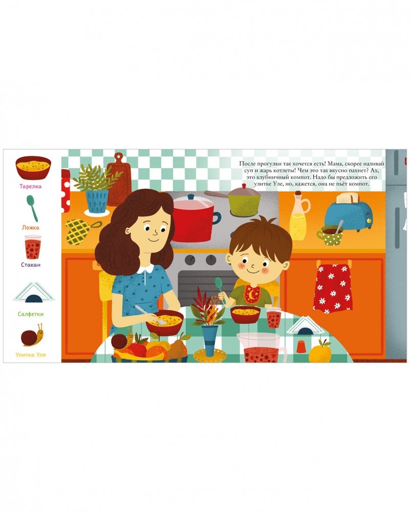 На каждом развороте маленьких читателей ждет яркая панорамная картинка, предметы для поиска, новые слова, знакомство с важными правилами и режимом дня. Играя в популярную и любимую всеми малышами 2-4 лет игру «найди и покажи», ребенок узнает, как важно умываться и чистить зубы, завтракать, гулять, вовремя ложиться спать. Читая вместе с милыми героями — мальчиком и его питомцем, забавной улиткой Улей, — короткие простые тексты, малыш все будет делать весело и по правилам.
