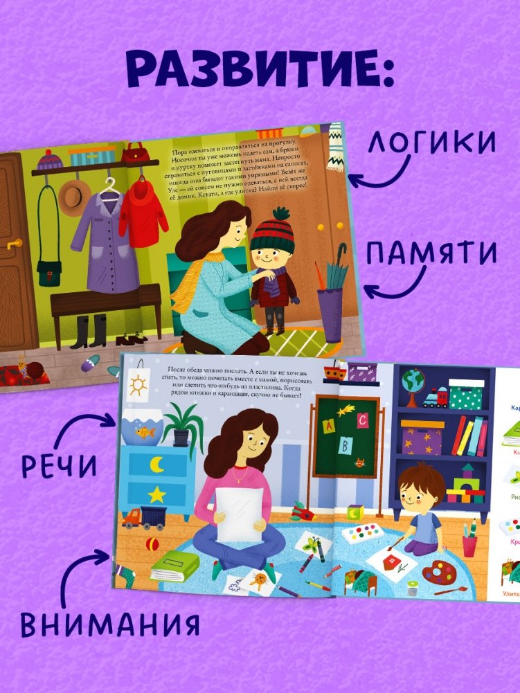 Красочные панорамные картинки, знакомство с режимом дня, развивающая игра «найди и покажи» — с этой книгой вы будете весело проводить время с детьми!