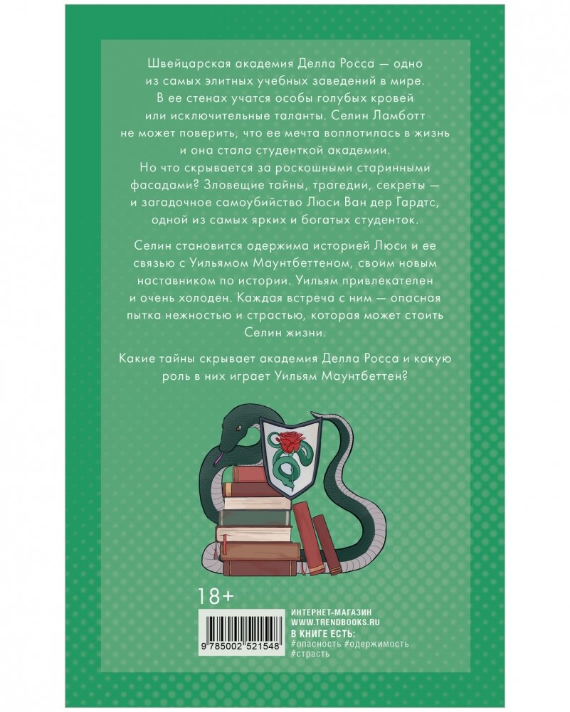 Селин Ламботт счастлива быть студенткой академии, где учатся особы голубых кровей и исключительные таланты. Но что за тайны скрывают старинные фасады? Почему покончила с собой самая яркая студентка Люси Ван дер Гардтс? И какое отношение к этому имеет новый наставник Селин — Уильям Маунтбеттен? Привлекательный и холодный… Встреча с ним — это пытка нежностью и страстью, которая может стоить Селин жизни.