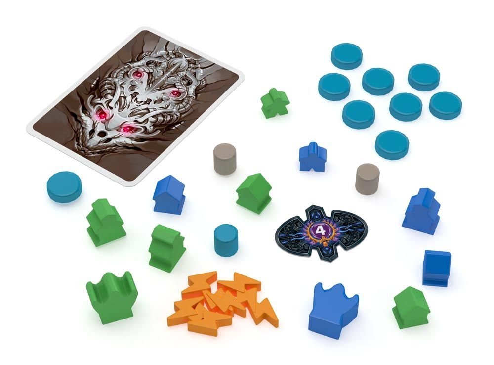 В состав настольной игры Проект «Возрождение» входит: игровое поле, 25 тайлов местности, 5 стартовых тайлов местности, 5 тайлов крупных локаций, 28 фишек энергии, 48 жетонов модулей, 30 жетонов механизмов, 28 жетонов контейнеров, 12 тайлов основных артефактов, 8 тайлов запасных артефактов.