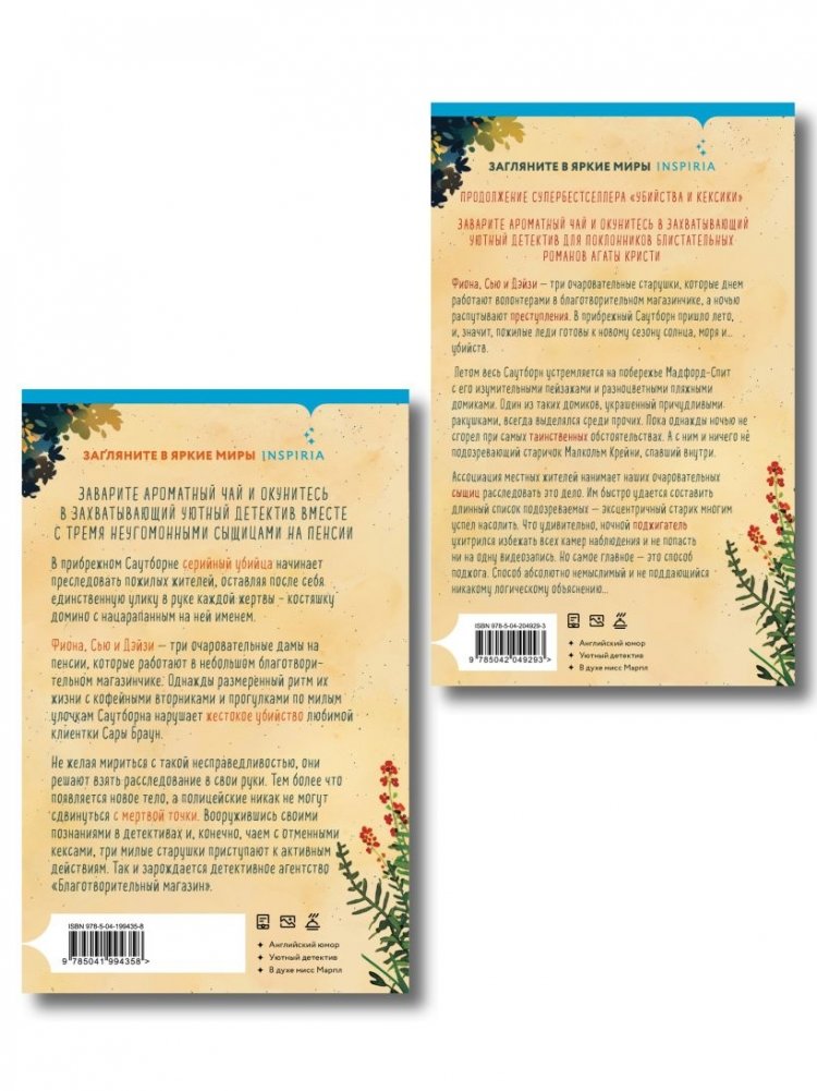 Детективное агентство "Благотворительный магазин" (#2) Фиона, Сью и Дэйзи – три очаровательные старушки, которые днем работают волонтерами в благотворительном магазинчике, а ночью распутывают преступления. В прибрежный Саутборн пришло лето, и, значит, пожилые леди готовы к новому сезону солнца, моря и… убийств. Летом весь Саутборн устремляется на побережье Мадфорд-Спит с его изумительными пейзажами и разноцветными пляжными домиками. Один из таких домиков, украшенный причудливыми ракушками, всегда выделялся среди прочих. Пока однажды ночью не сгорел при самых таинственных обстоятельствах. А с ним и ничего не подозревающий старичок Малкольмом Крейни, спавший внутри. Ассоциация местных жителей нанимает наших очаровательным сыщиц расследовать это дело. Им быстро удается составить длинный список подозреваемых – эксцентричный старик многим успел насолить. Что удивительно, ночной поджигатель ухитрился избежать всех камер наблюдения и не попасть ни на одну видеозапись. Но самое главное – это способ поджога. Способ абсолютно немыслимый и не поддающийся никакому логическому объяснению…