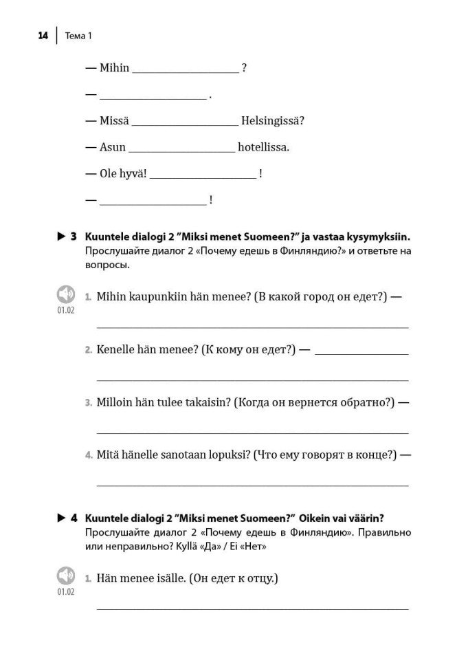 В приложении приводится информация по финской грамматике, а наличие ключей позволяет использовать книгу для самостоятельной работы. Пособие предназначено для владеющих финским языком на начальном или базовом уровне, будет полезно студентам 1–3 курсов факультетов иностранных языков и всем, кто изучает финский язык самостоятельно. Рекомендуемый уровень владения языком — от A1 до A2.
