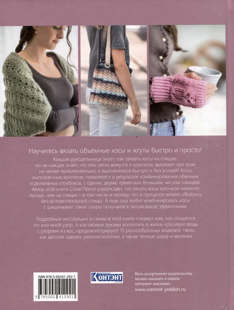 Автор этой книги Соня Прелл считает, что вязать косы крючком намного проще, чем на спицах — в том числе и потому, что в процессе можно обойтись без вспомогательной спицы. А еще она любит комбинировать косы с шишечками: такие узоры получаются потрясающе эффектными.