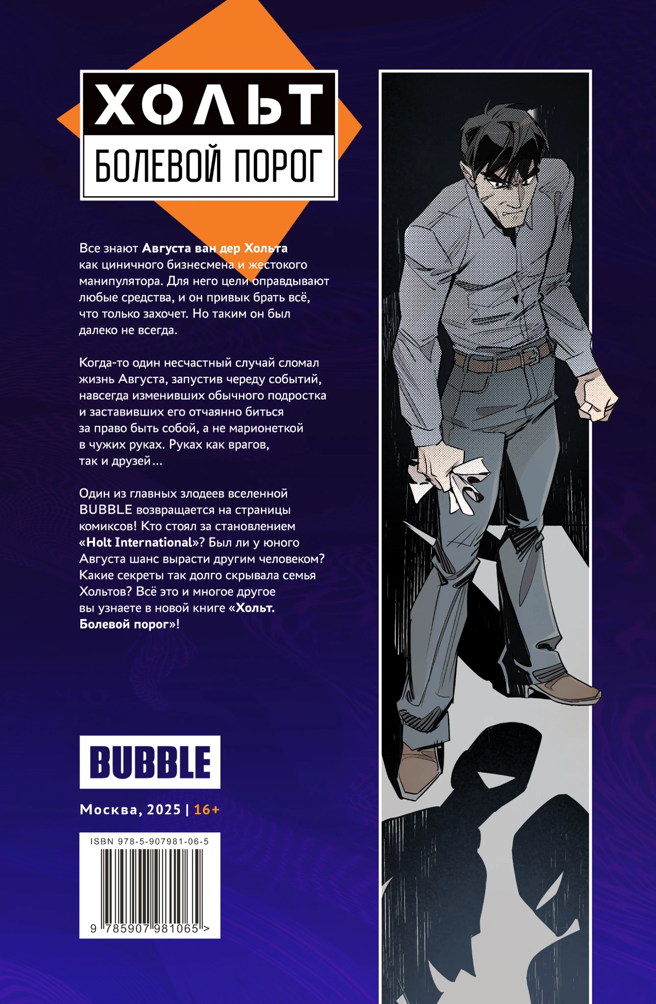 Один из главных злодеев вселенной BUBBLE возвращается на страницы комиксов! Кто стоял за становлением «Holt International»? Был ли у юного Августа шанс вырасти другим человеком? Какие секреты так долго скрывала семья Хольтов? Всё это и многое другое вы узнаете в новой книге «Хольт. Болевой порог»!