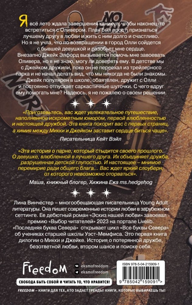 Новинка Лины Винчестер — популярного автора молодежной сентиментальной прозы. Первая часть дилогии «Последняя буква Севера» в антураже американской школы и рок-группы напомнит вам романы «Всем парням, которых я любила», «Сделка», а также фильм «Простушка». Роман расскажет о потерянной дружбе, втором шансе, любви и о том, как важно ценить себя.