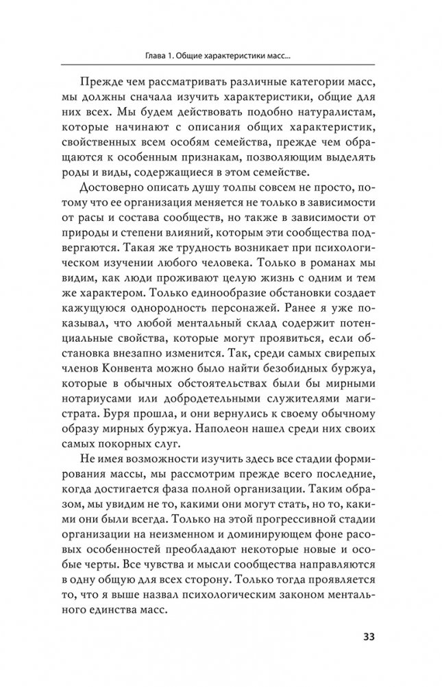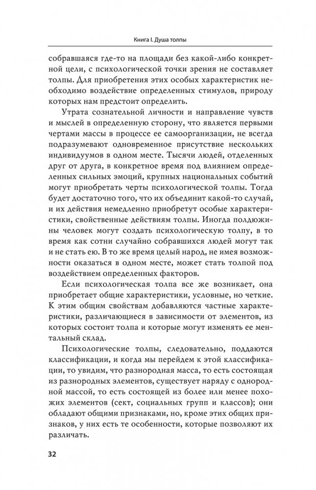Читая книгу, легко понять, что автор явно скромничал — идейный и содержательный масштаб его труда завораживает, на ста с лишним страницах он разместил полноценное изложение свойств и качеств народной массы, толпы как коллективного субъекта.