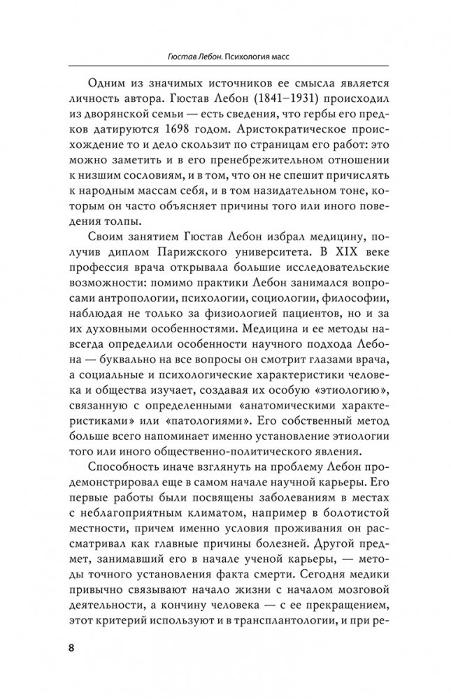 Лебон создал свой труд на злобу дня, в ответ на исторические вызовы, с которыми столкнулось европейское общество второй половины XIX века. Но эта книга стала настоящим проводником в пространство публичной жизни и в мир идей того времени — в ней описано начало общественных потрясений, на наших глазах разворачивается их завершение. А может быть, и продолжение...