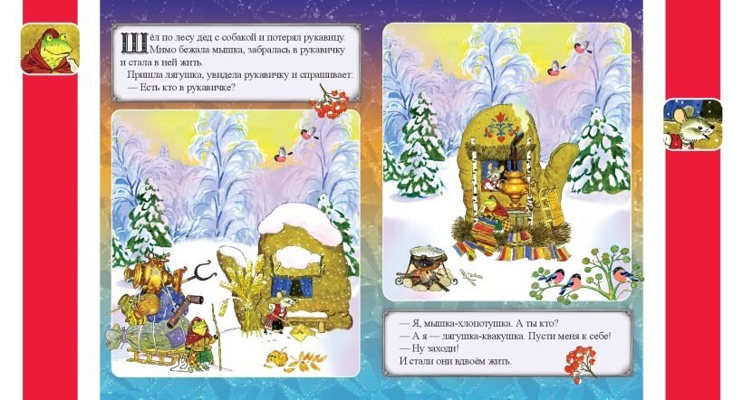Однажды один дедушка потерял в лесу рукавицу. Решили звери, что из неё получится отличный домик, и принялись сбегаться к ней один за другим. А рукавичка-то не резиновая!