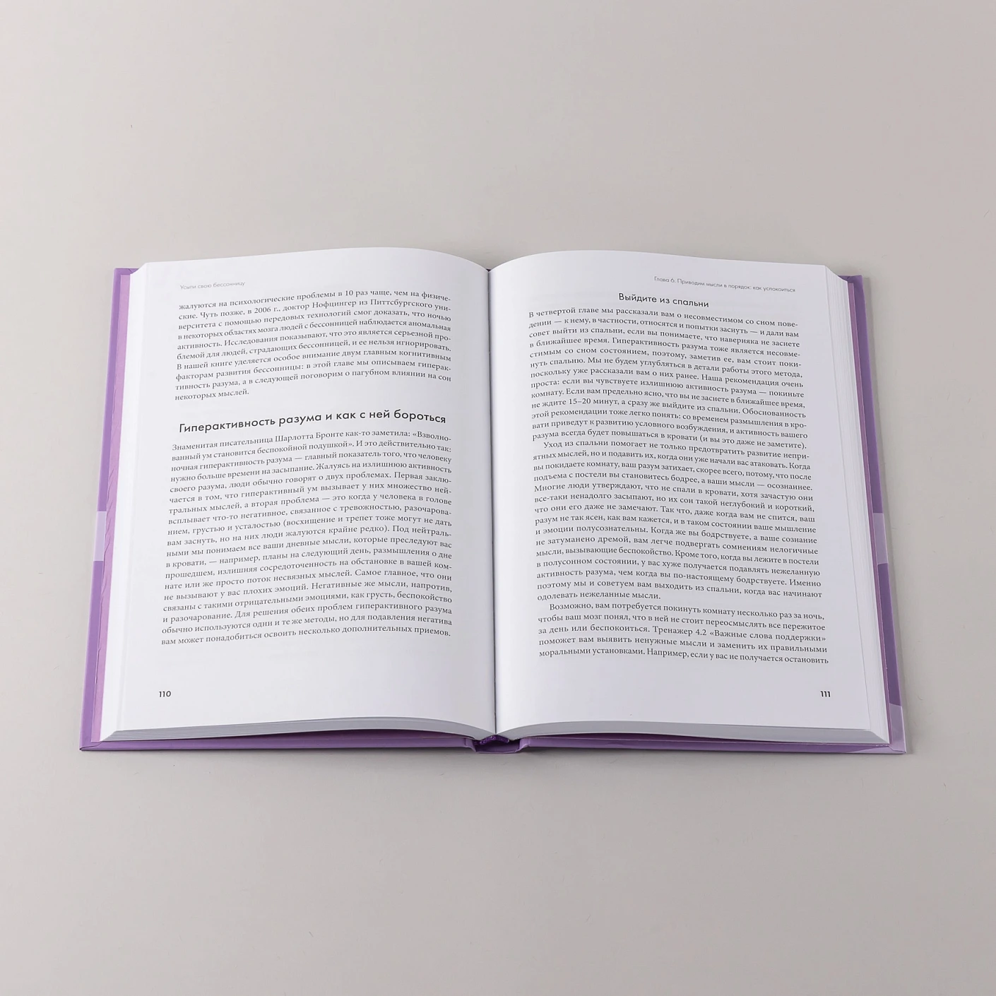 В книге «Усыпи свою бессонницу» Коллин Карни и Рэйчел Манбер, ведущие мировые специалисты по когнитивно-поведенческой терапии сна, объясняют: почему так важно строго придерживаться необходимого для вас времени сна и как его рассчитать; как успокоить гиперактивный разум, который не дает вам заснуть; почему необходимо сразу выходить из спальни, если сон не приходит.