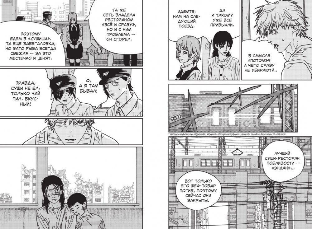 С боем прорвавшись через охрану, Аса и Глада спасают Дэндзи из Токийского центра содержания демонов. Вот только на этом злоключения Человека-Бензопилы не заканчиваются: юноша выясняет, что за время его отсутствия бесследно исчезла Наюта! Дэндзи намерен отправиться на поиски своей подопечной, но прежде решает восстановить силы самым банальным способом — как следует подкрепиться. Кто знал, что обычный обед в ресторане суши станет началом нового кошмара...