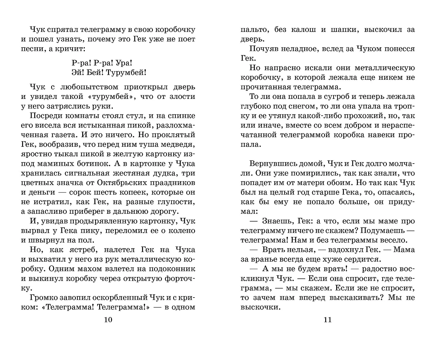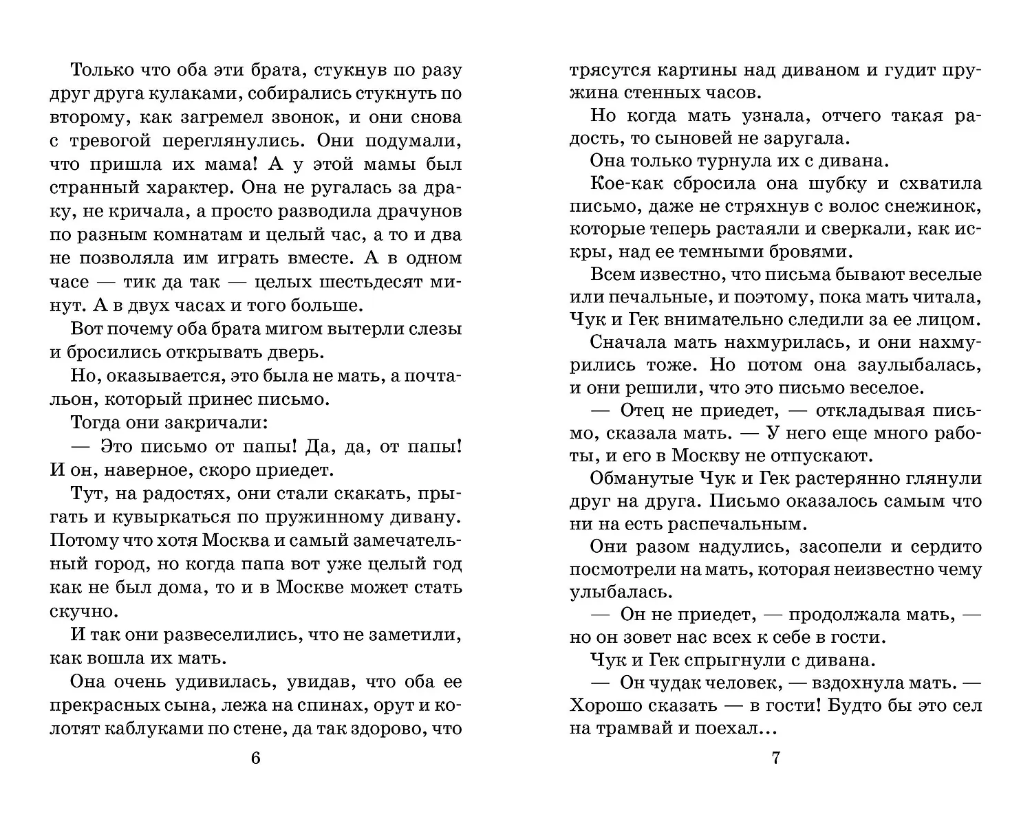 В эту книгу вошли произведения советского писателя Аркадия Гайдара: рассказы "Чук и Гек" и "Голубая чашка", повести "Тимур и его команда" и "Судьба барабанщика". Честь, храбрость, взаимо- помощь — эти ценности важны для героев произведений Гайдара, и писатель стремится передать эти ценности юному читателю. Для среднего школьного возраста.