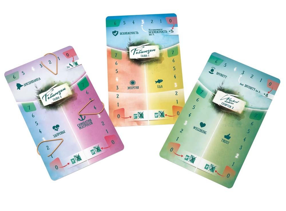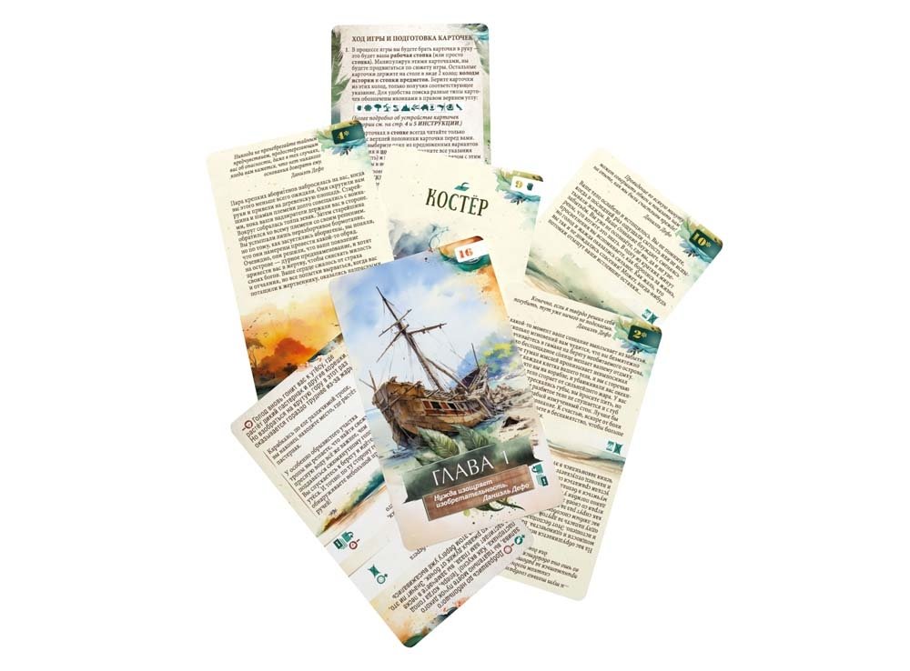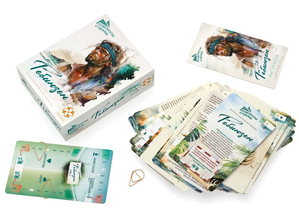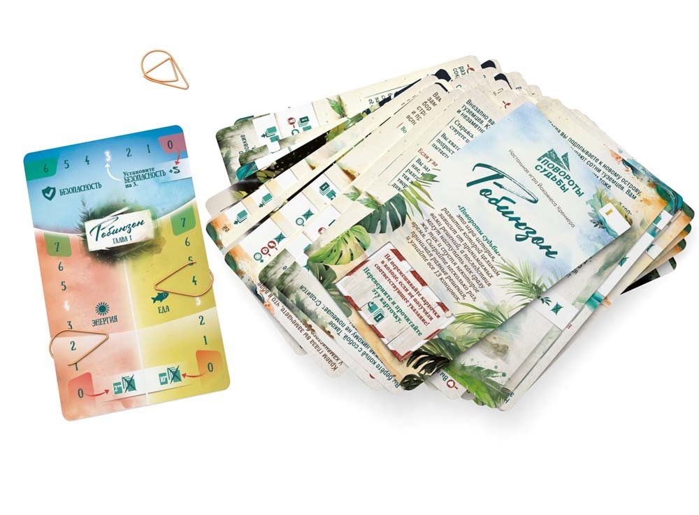 В состав настольной игры Повороты судьбы. Робинзон входит: 68 больших карт, 3 маркера-скрепки, буклет с инструкциями.