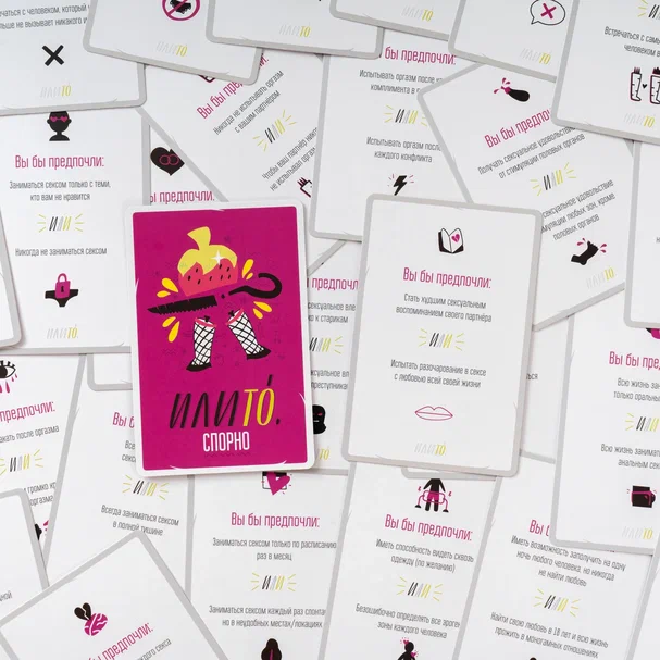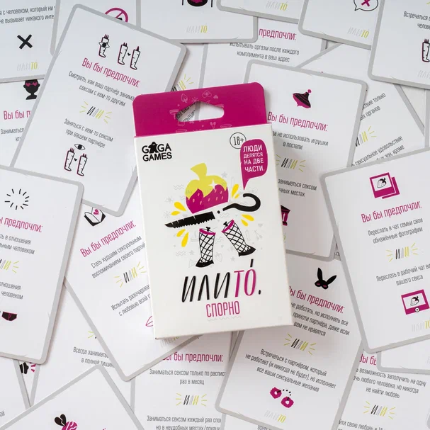 Каждый раунд сопровождается горячими спорами, неожиданными откровениями и целой армией скелетов, дружно покинувших тёмный шкаф. Ведь играть в ИлиТо Спорно можно большой компанией от 3 до 17 раскрепощённых ораторов. А можно устроить настольную дуэль без правил и задавать самые неудобные вопросы своей второй половинке, чтобы узнать друг друга получше. Эта игра, несомненно, добавит огонька в ваши отношения. Если, конечно, вы не побоитесь обжечься или вообще сгореть от стыда.