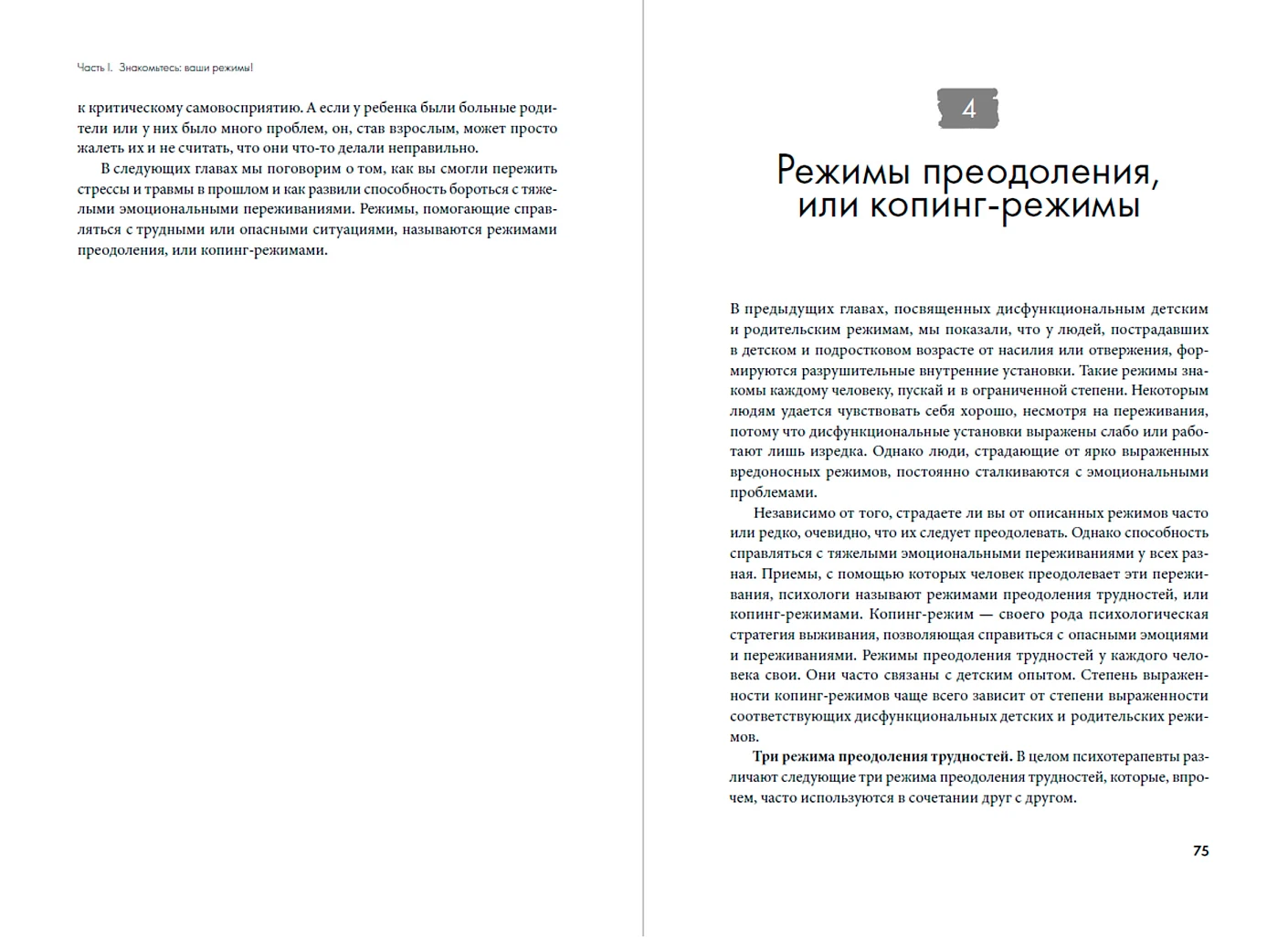 Эта книга — первое подробное руководство по новому направлению в психологии — схема-терапии. Авторы, опытные психотерапевты, рассматривают разные негативные режимы поведения и наиболее эффективные техники их преодоления или ослабления. Они помогут понять и осознать, какие из них мешают вам двигаться вперед, выяснить их происхождение, узнать, как они формировались на протяжении жизни и почему так устойчивы.