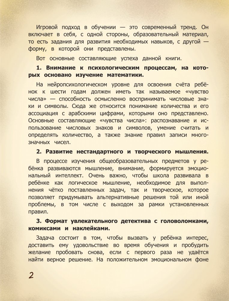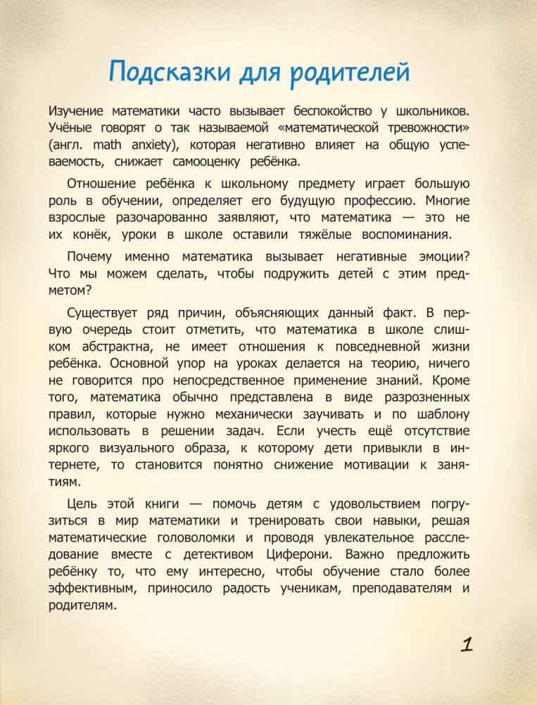 Зачем нужна математика? Это вопрос часто возникает у школьников. Книга-квест с детективным сюжетом, мате- матическими головоломками, комиксами и наклейками поможет им по-новому взглянуть на уроки в школе. Они поймут, что законы математики окружают человека. Поиск улик поможет детям применить на практике свои знания. Они потренируются выполнять арифметические действие в пределах 1000, повторят таблицу умножения, дроби, легко решат логические задачи, а также задачи на движение, вспомнят геометрические фигуры и не только. В результате возрастёт интерес к предмету и навсегда будет преодолён барьер так называемой "математической тревожности".