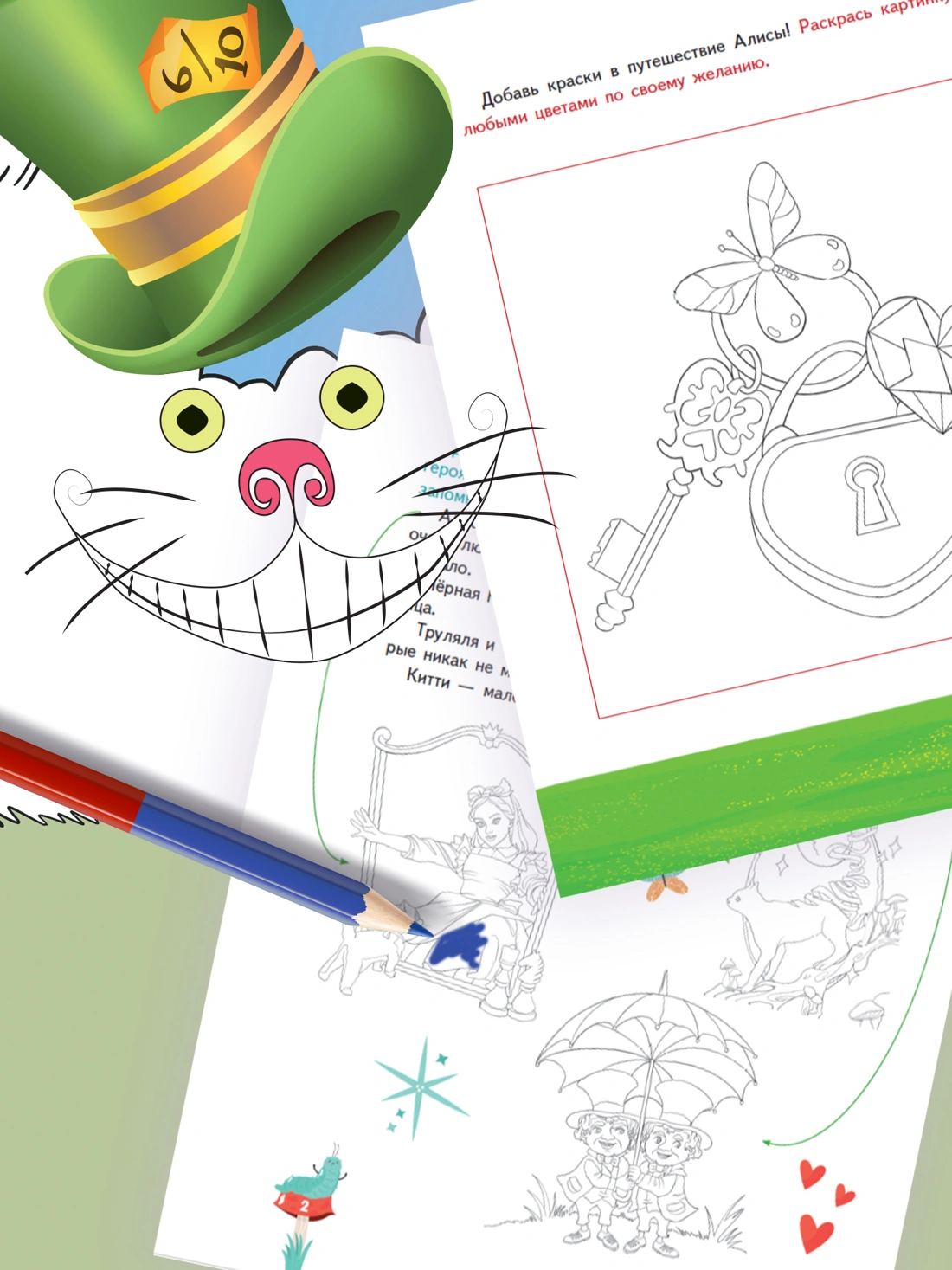 В этой книге тебя ждут захватывающие задания, которые позволят исследовать удивительные приключения Алисы и познакомиться с яркими персонажами: Честерским котом, Безумным Шляпником и Червонной королевой.