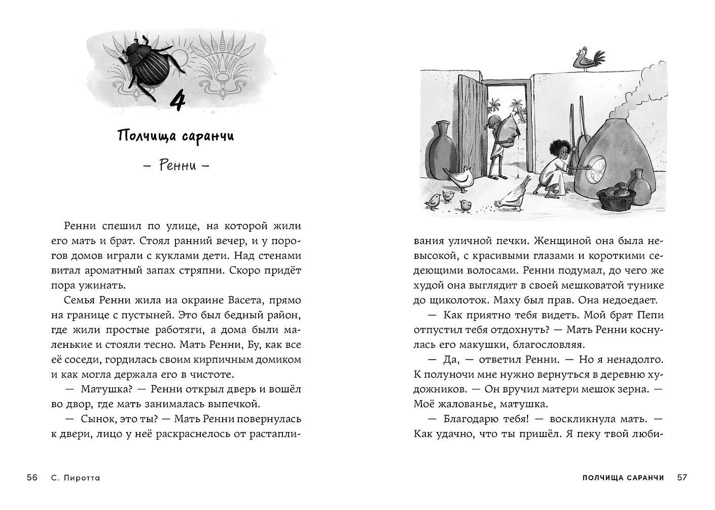 Погрузитесь в загадочный и волшебный мир Древнего Египта! Ренни и его брат Маху, не подумав, украли амулет в виде скарабея из древней гробницы. И теперь, если они не вернут его владельцу, могущественному генералу, им не избежать беды! Но когда амулет пропадает, ребятам предстоит разгадать тайну воров и найти его, пока не стало слишком поздно. Захватывающее приключение, полное тайн, дружбы и магии, которое учит детей смело справляться с последствиями своих поступков и разгадывать сложные загадки.