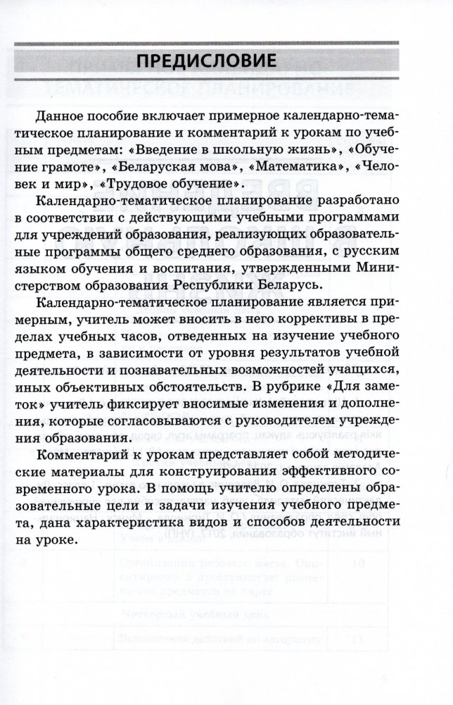 Данное пособие включает примерное календарно-тематическое планирование и комментарий к урокам по учебным предметам: "Введение в школьную жизнь", "Обучение грамоте", "Беларуская мова", "Математика", "Человек и мир", "Трудовое обучение".