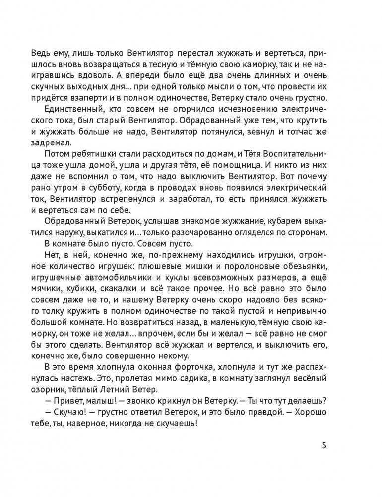 Жил-был Ветер. Даже не совсем Ветер, а так, Ветерок. И жил он не в лесу, не в поле, а в… старом вентиляторе из детского садика № 5. Когда вентилятор включали, Ветерок вылетал наружу и играл с ребятишками. Обо всех этих и о многих других удивительных приключениях маленького Ветерка и рассказывает эта книга.