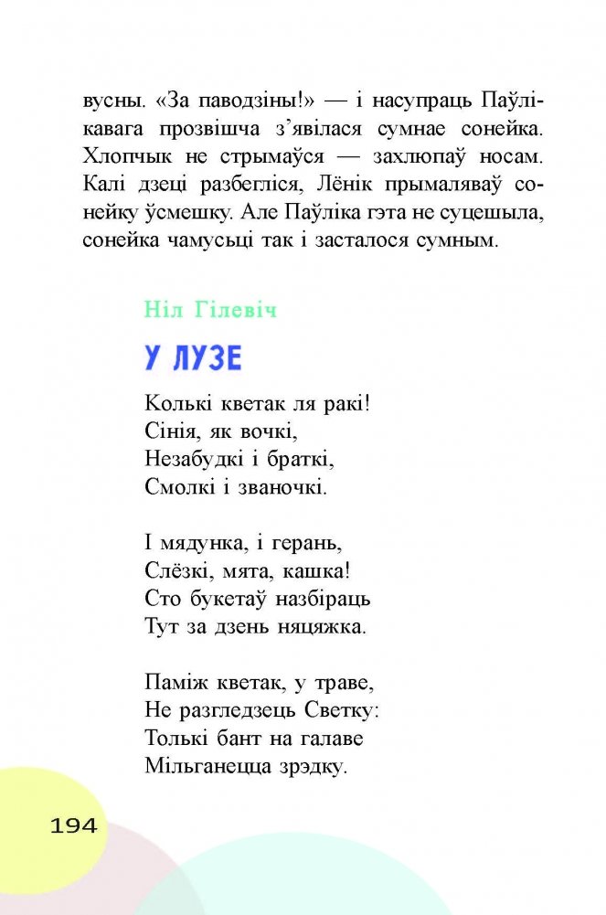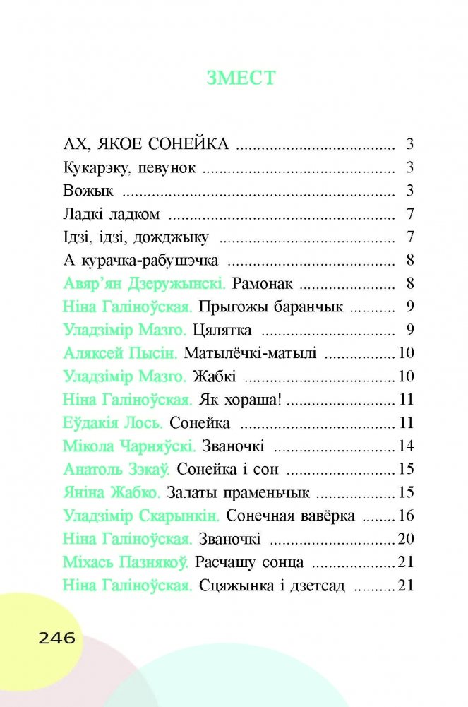 У кнігу ўвайшлі дзіцячыя вершы і апавяданні на роднай мове. Чытанка складаецца з сямі тэматычных раздзелаў, дзе распавядаецца пра сям'ю, сяброўства, добрыя паводзіны, пра з'явы прыроды, школу і кнігу, любоў да Радзімы.
