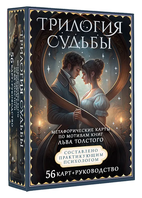 Трилогия судьбы — уникальная колода метафорических и литературных карт, вдохновленная известными романами Л. Н. Толстого "Война и мир", "Анна Каренина" и "Воскресение". Эти карты станут вашим надежным инструментом для самопознания, личностного роста и работы с внутренними конфликтами. Колода составлена практикующим психологом с многолетним стажем. Колода состоит из 56 карт, каждая из которых отражает архетипы личности и теневые проявления. Каждая карта колоды – это метафора, отражающая сложные человеческие чувства, мотивы и жизненные сценарии. Для большего погружения на каждой карте находится цитата, которая поможет найти ответы на вопросы и по-новому взглянуть на знакомые романы. Подарите себе или своим близким возможность заглянуть вглубь себя и открыть новые смыслы в произведениях классика.