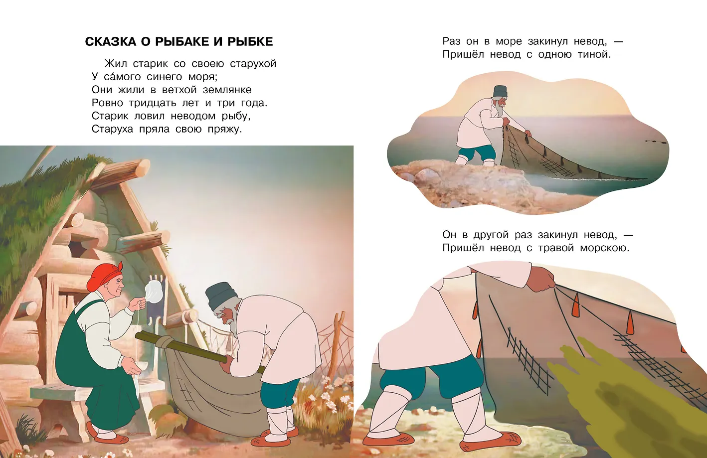 В книгу вошла знаменитая "Сказка о рыбаке и рыбке" А. С. Пушкина. Сказка о жадной старухе, добром старике и волшебной золотой рыбке входит в программы школьного чтения. Текст дан без сокращений и адаптаций. В 1950 году по "Сказке о рыбаке и рыбке" был снят одноимённый музыкальный мультфильм. А в 1951 году он получил премию "За лучший мультфильм" на Международном фестивале. Как и наша книжка, он начинается с пролога из поэмы А. С. Пушкина "Руслан и Людмила".