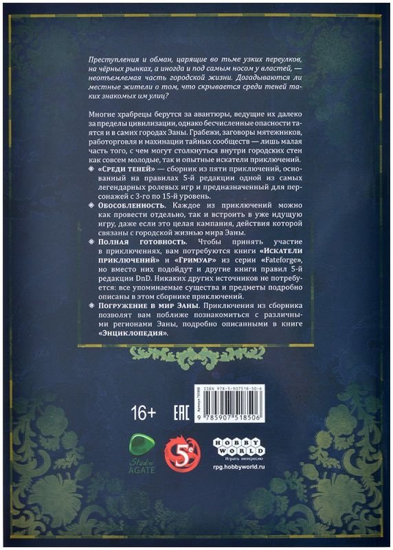 Многие храбрецы берутся за авантюры, ведущие их далеко за пределы цивилизации, однако бесчисленные опасности таятся и в самих городах Эаны. Грабежи, заговоры мятежников, работорговля и махинации тайных сообществ – лишь малая часть того, с чем могут столкнуться внутри городских стен как совсем молодые, так и опытные искатели приключений.