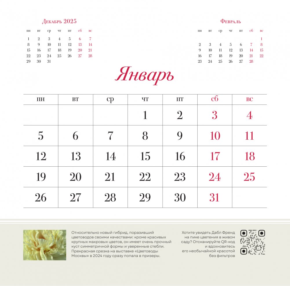 Проведите 2026 год в окружении цветущих пионов! Этот цветок – символ процветания и богатства, любви и романтики, исцеления и удачи. Каждый месяц в календаре украшен изысканной фотографией пиона и сопровождается полезными ссылками на рекомендации опытного пионовода Любови Аристарховой. Наслаждайтесь свежестью пионов вместе с "Пионовым раем" круглый год!