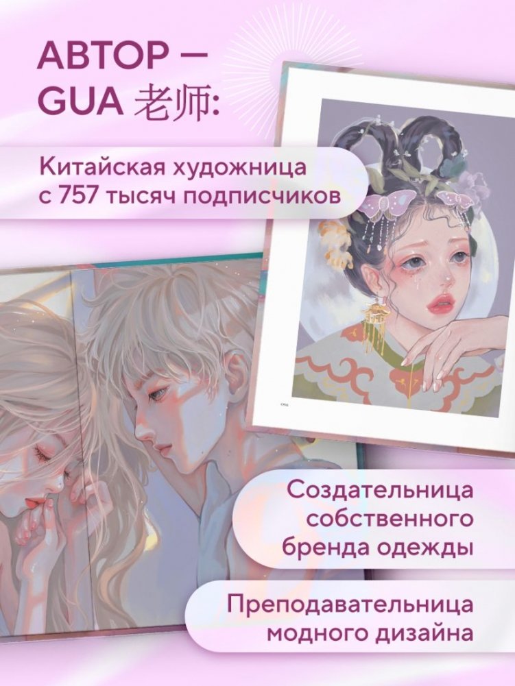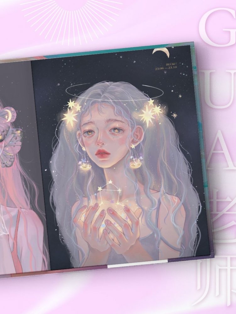 "Девушки, как звезды" — дебютный артбук популярной китайской художницы Учителя Гуа (gua老师). Более ста иллюстраций объединены в изящные тематические главы — от зодиаков и растений до мотивов античности и моды. Нежные пастельные тона, изысканные образы и вдохновляющая эстетика — приглашение в мир, где красота девушки становится искусством.