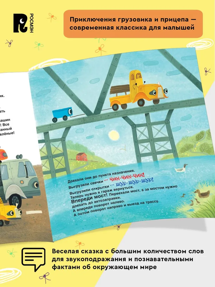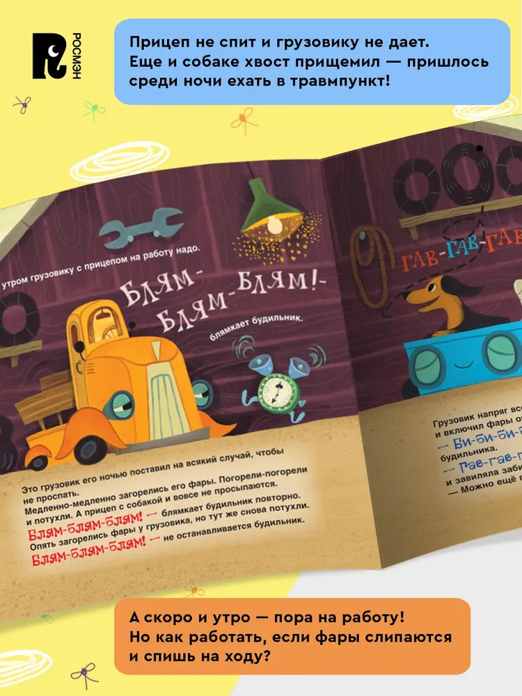 Весь день работал грузовик — теперь поспать бы! А вот у прицепа сна ни в одной фаре! Прицеп сам не спит и грузовику не дает уснуть. Еще и собаке хвост случайно прищемил - пришлось грузовику в травмпункт ее везти среди ночи. А тут и утро наступило, и снова на работу. Но как работать, если фары слипаются и спишь на ходу?